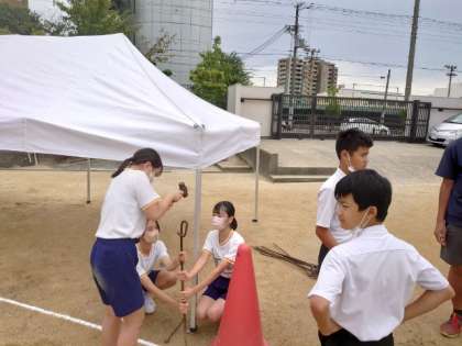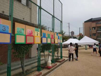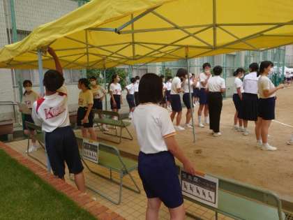 着々と会場準備がすすんでいます。得点板の設置も終わり、放送委員さんのアナウンスが運動場に響いています。体育大会にむけて雰囲気が盛り上がってきました。
