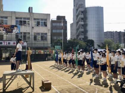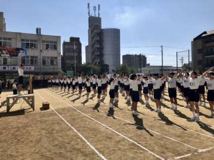 競技上の注意事項が伝えられ、プログラム1番ラジオ体操が行われています。しっかりストレッチしましょう。