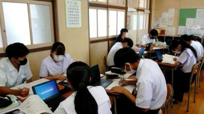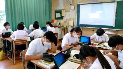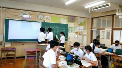 3年生数学科で自動車の速度と停止距離の問題を関数を使って解いています。グループ毎に話し合いながら答えを導き出します。「スピードの2乗÷(254×路面の摩擦係数)」で制動距離が求められるそうです。かなり高度な計算式ですね。