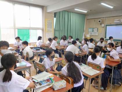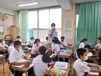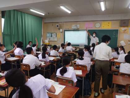 1年生英語の授業で教科書の会話文を暗唱します。「Does」を使った疑問文が中心のお話です。できるだけ教科書を見ないように、お友だちとやりとりしましょう。