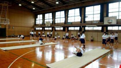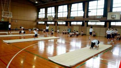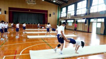2年生女子体育でマット運動の授業が始まりました。まずはペアを組んで手押し車で肩慣らし。前転や後転、倒立前転と技を磨きます。身体をまるめたり、足を振り上げたり、全身を上手く使いましょう。