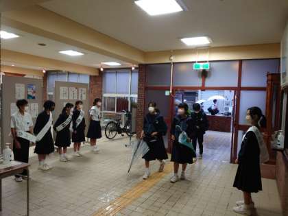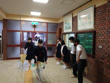 傘をさす手が冷たい雨に濡れ、より寒さを感じる朝。教室で水気をよく拭いてくださいね。今日は生徒会役員選挙の投票日。玄関ピロティでは候補者の皆さんが最後のお願い中。6時間目の演説会、頑張ってください!