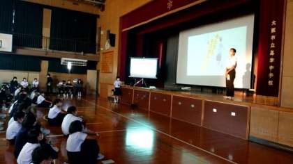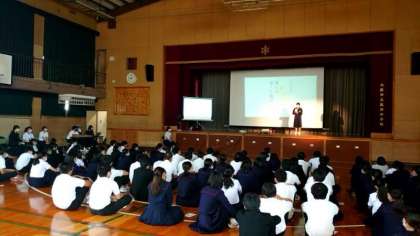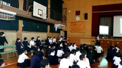 体育館に3年生が集まり「ビブリオバトル」を開催しています。オススメ本の魅力を身振り手振りを交えて紹介します。皆さんの巧みな話術はさすが3年生。文化祭での発表も楽しみです。