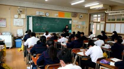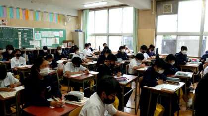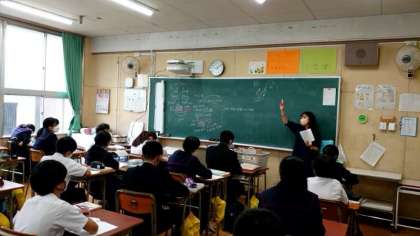 1年生数学の授業で一次方程式の文章題を解いています。先生が解き方のポイントをていねいに説明中。明日から始まる中間テストに出るかも。しっかり聞いて、お家で復習してくださいね。