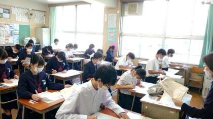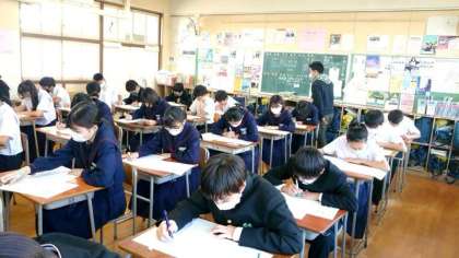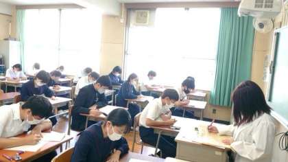 1時間目英語のテストが始まりました。長文読解や英作文、単語のアクセントなど幅広く出題されているようです。体育大会3年学年演技で使った楽曲に関する問題もありますね。みんなで歌ったのを思い出しましょう。