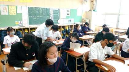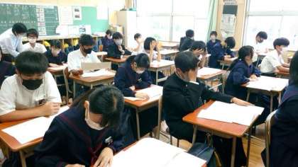 先週実施した中間テストの答案が返却されています。2年生の教室では英語のテストが返ってきました。先生の解説後、各自が間違えた問題を見直し中。お家に帰ったら改めてやり直しましょう。