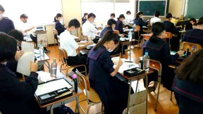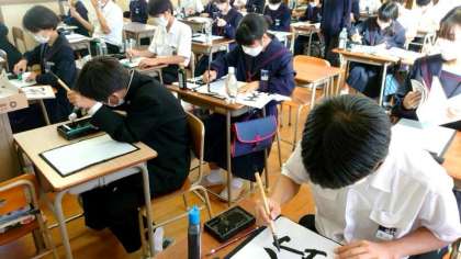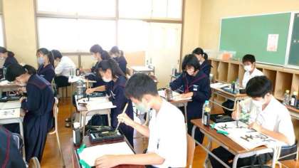 1年生国語科で書写の学習中。毛筆を使って「天地」の文字を書いていきます。鉛筆とは持ち方や力の入れ方が異なるので難しいですね。繰り返し練習してポイントをつかみましょう。