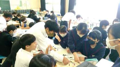 2年生の皆さんが理科室にやってきました。直列回路と並列回路で流れる電流の大きさがどのように変わるかを実験します。各班毎に計測キットが渡され、実験スタート。皆さん、うまく計測できましたか?