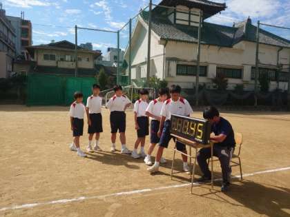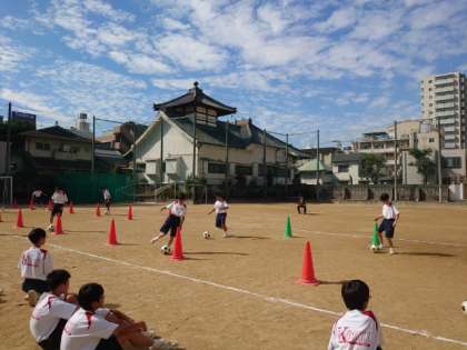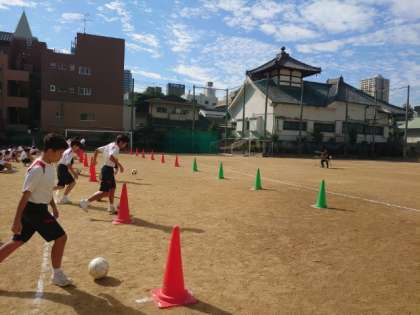 1年生男子体育の授業でサッカーの練習中。今日は並べられたコーンの間をドリブルで5周するタイムを測ります。クラスメイトの応援が嬉しいですね。皆さん自己ベストは何秒でしたか?