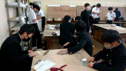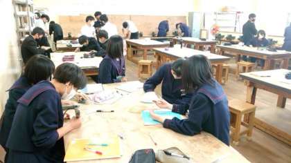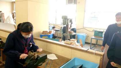 2年生技術科で取り組んでいる金属加工実習。メモ(フォト)スタンドの表面のデザインを彫りあげ、現在ピカピカに磨きあげる工程に入っています。皆さん紙ヤスリや薬品を使って磨いていますが、腕がダルくなりそうですね。