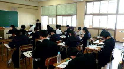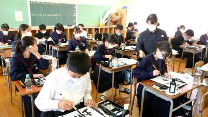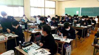 1年生国語科で書写の授業を行っています。毛筆を使って「天地」の文字を繰り返し練習します。来週水曜日の文化祭で皆さんの作品を展示する予定とのこと。完成が楽しみです。