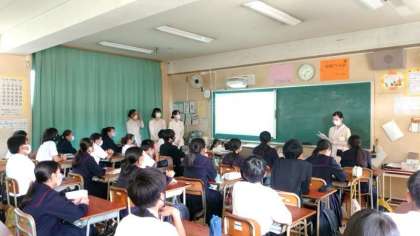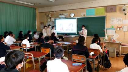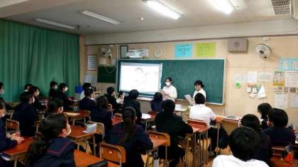 現在1年生の各教室で「歯と口の健康教室」が行われています。校区にある歯科衛生士専門学校の方々に来ていただき、健康な歯・口を保つ大切さを教わります。専門学校の皆様が今日のために映像資料をたくさん用意してくださりました。1年生の皆さんもふだんから歯の健康維持を心がけましょう。
