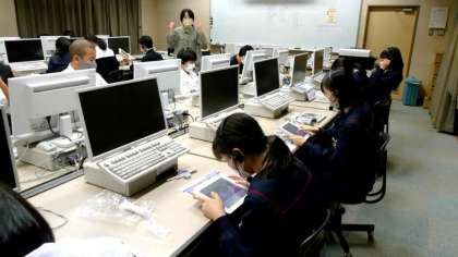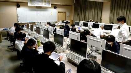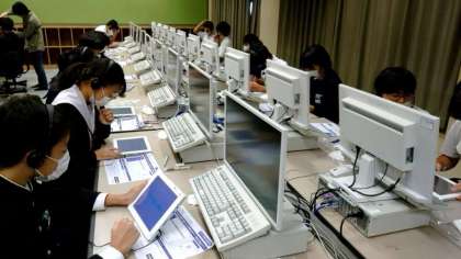 英語の4技能を測定するGTEC。「話す力」のテストが始まりました。専用のタブレット端末とヘッドセットが配られ、タブレットから流れる問題に答えていきます。ヘッドセットに付いているマイクに向かってハッキリ明瞭に発音してくださいね。