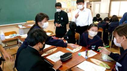 1年生の皆さんが板ハガキの絵付けを行っています。一泊移住で宿泊した奈良県天川村の風景を描きます。緑豊かな大自然の中、クラスメイトと楽しく過ごした思い出がよみがえりますね。