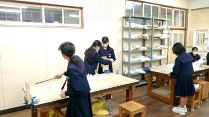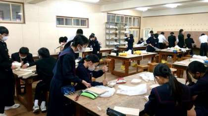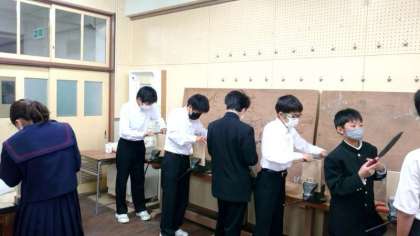 1年生技術科で製作している木製ラック。ノコギリを使って一枚板を切り分け、ラックの部品が出来上がりました。今日は各部品をヤスリがけし、サイズのバラつきを整えます。皆さん夢中になって取り組んでいます。