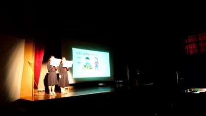 生徒会保健委員の皆さんの発表です。食事・睡眠・運動と健康について調べてくれました。コントも織りまぜた発表に会場も盛り上がります。