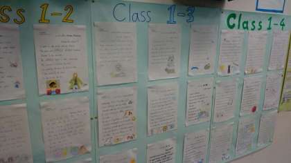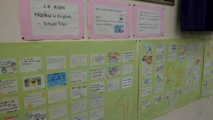 午後は展示作品を鑑賞します。英語科は1年が絵日記、2年がユニバーサルデザインの調べ学習、3年は英語で俳句を作りました。