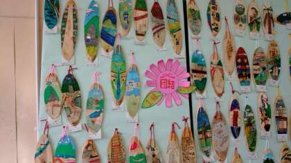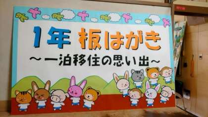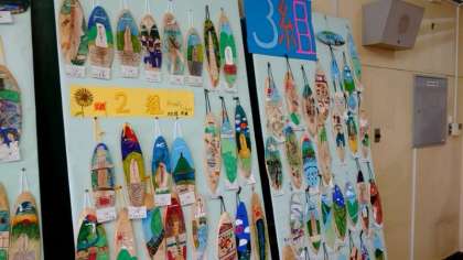 数学教室には1年生の作品が飾られています。一泊移住の思い出を板ハガキに描きます。緑豊かな自然の景色がいっぱいです。