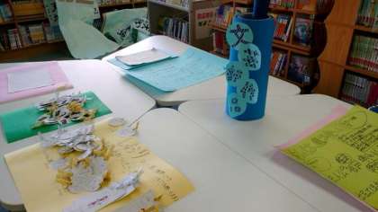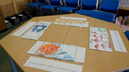 文芸部の皆さんが考えた小説が展示されています。また、みんなで作った栞や、和歌をベースにしたイメージイラストもあり、想像力の豊かさを感じます。