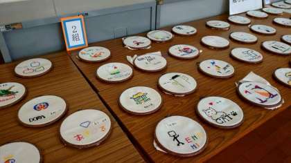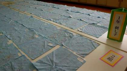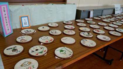 被服室には家庭科の授業で作った作品が並んでいます。1年生は刺し子のししゅう、2年生はクロスステッチに取り組みました。クロスステッチの色づかいがキレイですね。