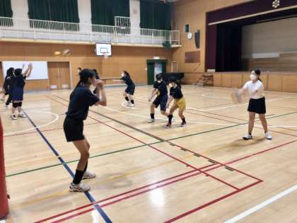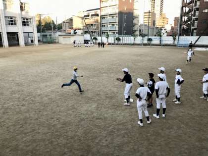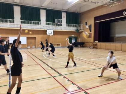 真田山小学校では女子バレーボール部と野球部が活動中。パスやレシーブのフォームを中学生が教えています。野球部はベースランニングの速さを競っています。どちらも楽しそうですね。