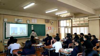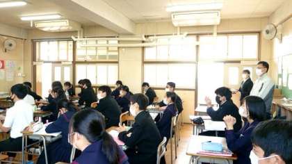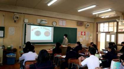 2年生英語の授業で「比較級」を教わります。形容詞の語尾に「er」を付けて「〜よりも◯◯」と表現します。スクリーンには「10円玉と100円玉、どちらが大きいでしょう?」の質問が。皆さん比較級を使って答えましょう。