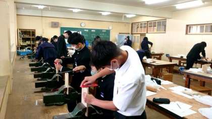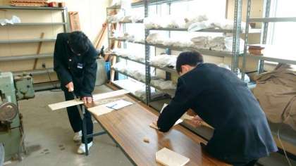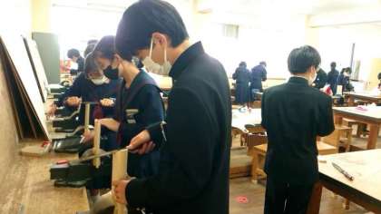1年生技術の授業で製作している木製ラック。技術室からノコギリ・ヤスリがけのにぎやかな音が聞こえてきます。各パーツを切り出した後、ヤスリをかけて形を整えます。ヤスリがけが結構時間がかかるみたいですね。