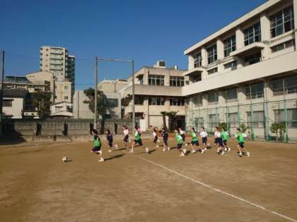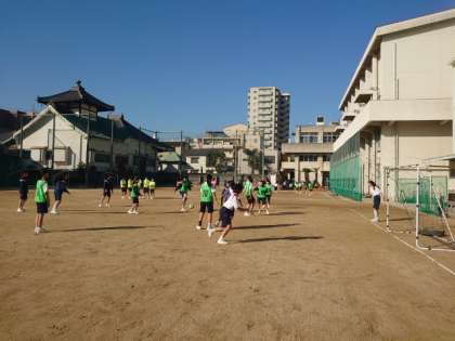1年生女子体育でサッカーの試合を行っています。パスやドリブルなど、これまでの練習の成果を試合で発揮します。コートを元気に走り回る姿が良いですね。皆さんとても楽しそうです。