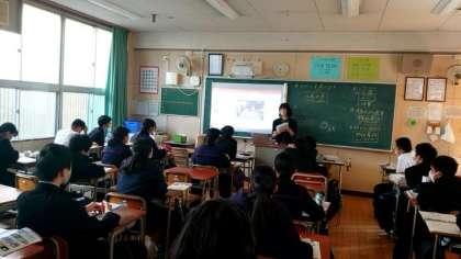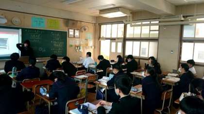 1年生理科の授業で金属の性質を学びます。金属は電気や熱がよく伝わる物質です。また引っ張ったり叩いたりすると、伸びたり薄く広がる性質があるとのこと。スクリーンにはアルミホイル生産の映像が映されます。アルミニウムを0.012ミリの薄さまで伸ばす技術はスゴいですね。