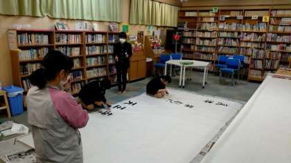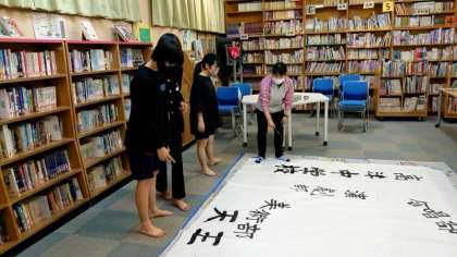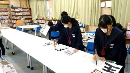 放課後の図書室で書道部の皆さんがお稽古中。来月3日に開催される「天王寺区市立中学校合同文化祭」。当日のステージ発表の練習に励んでいるそうです。当日のパフォーマンスが楽しみです。