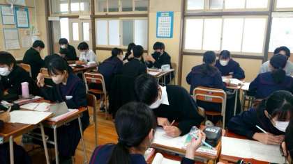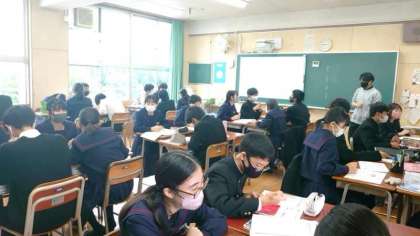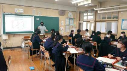 2年生英語の授業でC-NETのミック先生と英会話のレッスン中。今日は友だちに英語でインタビューを行います。90秒毎に相手が次々に代わるので、質問がハッキリと聞き取れるよう工夫が必要ですね。