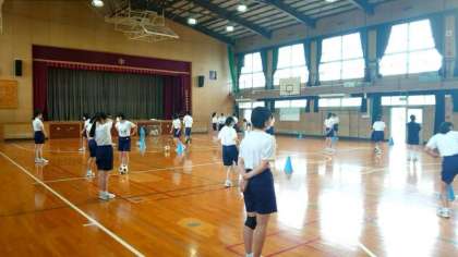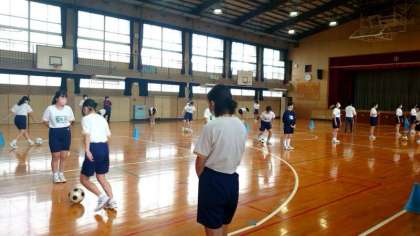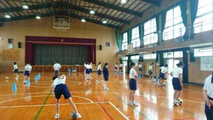 3年生女子の皆さんがサッカーの練習中。昨夜の雨で運動場の状態が良くないため、体育館でドリブル練習に取り組みます。クラスメイトの周りを八の字にドリブルします。運動場に比べて距離が短く、ボールコントロールが難しそうです。