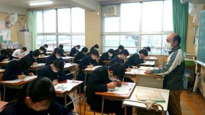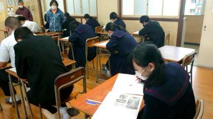 2時間目は美術のテスト。3年生の皆さんが美術史の問題を解いています。奈良時代の仏像や室町時代の建築物が出題されています。社会科でも習ったハズ。写真資料をよく見て答えましょう。