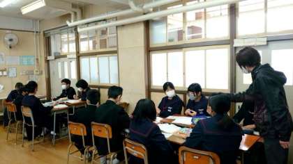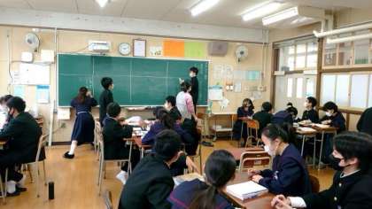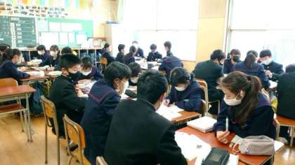 1年生国語科で芥川龍之介の「トロッコ」を鑑賞中。作品も最後のくだりを迎え、グループで意見を出し合い、主人公良平の心情を考えます。いろんな意見が出ることで多角的な視点が磨かれますね。