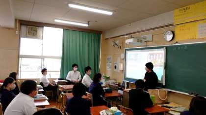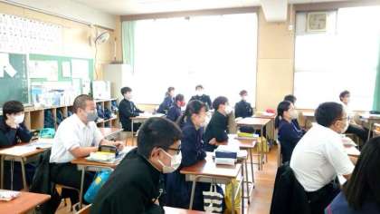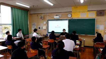3年生英語科で仮定法を教わります。「If+主語+過去形〜 , 主語+would+動詞の原型 (もし〜ならば、〜します)」を使って英文を考えます。スクリーンには宝くじ(lottery)の画像が映されます。もし宝くじが当たったらどうしますか?を英語で表現してみましょう。