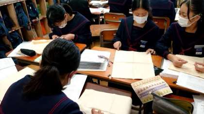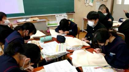 1年生家庭科で取り組んでいるスウェーデン刺繍。皆さんグループになって制作しています。どう縫っていけば良いか、お互いに相談しながら取り組めるのがグループ学習の良いところ。和気あいあいとした雰囲気が良いですね。