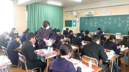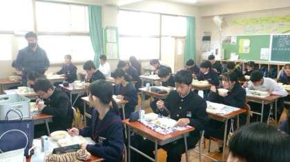 お昼休みのチャイムが鳴り、お楽しみの給食の時間。今日の献立は、豚肉の生姜焼・さつま芋のお味噌汁・きくなと白菜のゴマ和えです。2年生の教室では皆さん美味しく食事中。いっぱいいただいて午後の活動も頑張りましょう。