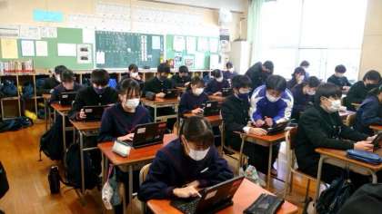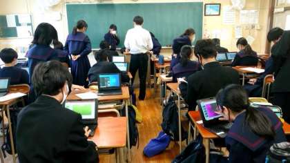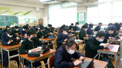 2年生の皆さんが職業について調べ学習に取り組みます。自らが関心を持ったお仕事について調べた内容を、タブレット端末を使ってスライド資料にまとめます。皆さん、写真やイラストを取り込みながら楽しく作成しています。