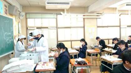 4時間目の授業が終わり、給食の時間になりました。今日のメニューは「カレーうどん・白菜のおひたし・リンゴ・おさつパン」。甘口のルーで煮込んだカレーうどん。身体がじんわりと温まりますね。
