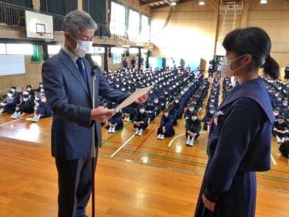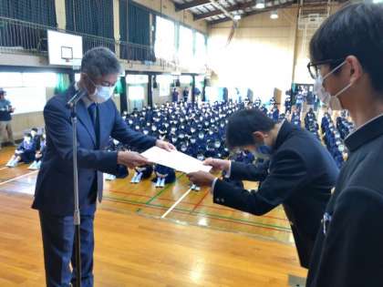 今朝の全校集会で、読書感想文コンクールとサッカー部の対外試合の表彰式が行われました。皆さんの温かい拍手が嬉しいですね。受章された皆さん、おめでとうございます!
