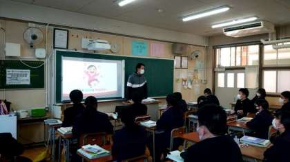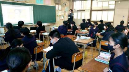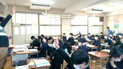 1年生英語の授業で「look+形容詞(〜のように見えます)」の英文を学習します。スクリーンにはさまざまな表情のイラストが次々に映され、皆さん英語で答えます。使い方はマスターできましたか?