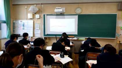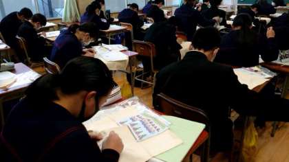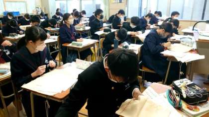 1年生家庭科で製作しているスウェーデン刺繍のランチョンマット。先生が書画カメラを使って刺繍飾りの縫い方を実演中。スクリーンに縫っている映像が映されるので、皆さん参考にしやすいですね。