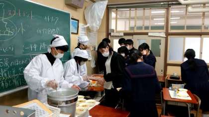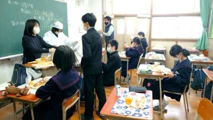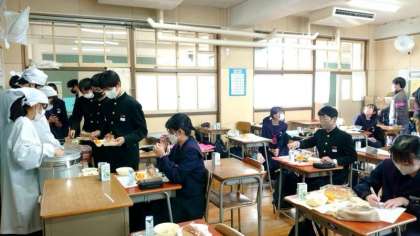 お昼のチャイムが鳴り、お待ちかねの給食の時間。今日の献立は「キノコのドリア・鶏とじゃが芋のスープ煮・ミカン」。2年生の教室では配膳の真っ最中。スープで身体を暖めて午後の授業も頑張りましょう。