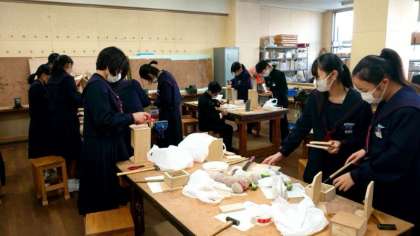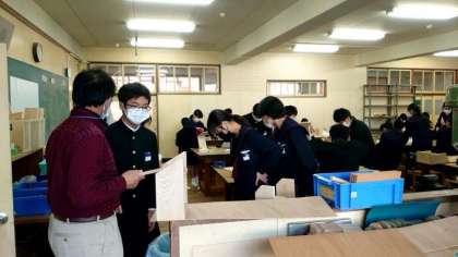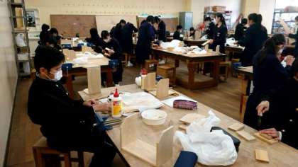 1年生技術科で製作している木製ラック(飾り棚)。皆さん、完成をめざして頑張っています。木工ボンドで接着する人や金づちで釘を打つ人などさまざまです。ずいぶん形は出来てきましたがもう少し時間がかかりそう。完成は年明けになる模様です。