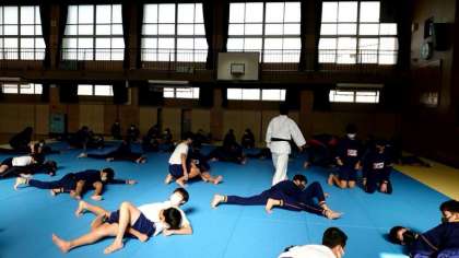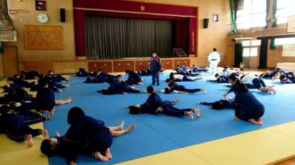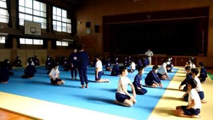 2年生の皆さんが柔道の稽古中。今日は「寝技(縦四方固め)」を教わります。技のかけ方を習った後、お互いに試してみます。一度技が決まったら、なかなか返す(技を解く)ことができませんね。