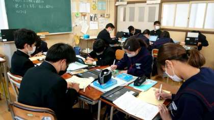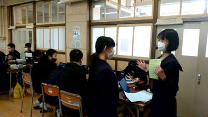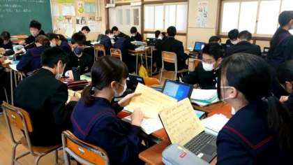 1年生英語の授業でプレゼンテーションの動画を作成しています。環境保健など関心のあるテーマを英文にまとめ、タブレット端末を使ってスピーチを自撮りします。お友達と相談しながら、楽しく取り組んでいます。