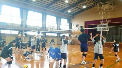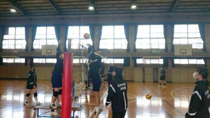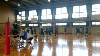 体育館から女子バレーボール部の元気な声が聞こえてきました。現在ブロックの練習中。タイミングを測って相手のスパイクをブロックします。指先にしっかり力を入れて突き指に気をつけてくださいね。