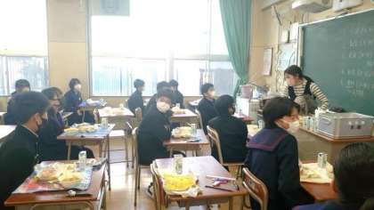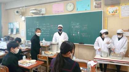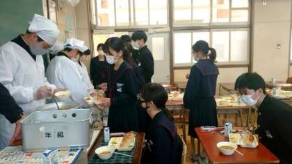 お昼休みになり給食の準備が始まりました。今日は「ミートボールと野菜のカレー煮・ツナとキャベツのソテー・リンゴ」の洋食メニュー。1年生の教室では当番の皆さんがおかずを盛り付けています。今年最初の給食をみんなで美味しくいただきましょう。