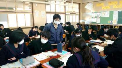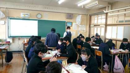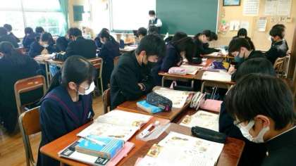 2年生英語の授業でグループ学習を行っています。教科書の物語を読み、各自が登場人物のセリフを覚えて英語劇を演じるとのこと。英文の暗唱はもちろん、感情を込めて表現するのが難しいですね。