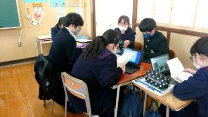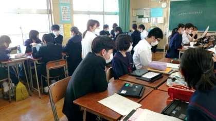 3年生理科の授業で「外来生物」の調べ学習中。日本の生態系に影響を及ぼすおそれのある生き物をタブレット端末で検索します。インターネットを使うと次々に出てきます。皆さんが気になった外来生物は何ですか?
